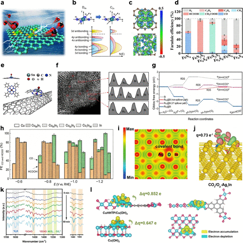 Figure 9. (a) Scheme of ECR-to-HCOOH activity for In Sas/NC. Reproduced from ref (224). Copyright 2020, Wiley-VCH. (b) Schematic diagrams of band shifts and hybridization for the planar CuN4 moiety with local D4h symmetry and the defective CuN3 moiety with lower local C2v symmetry. a.u. arbitrary units. Reproduced from ref (133). Copyright 2023, Springer Nature. (c) EDD plots of FeN4 and FeN2S2. (d) Distribution of ECR products over different Fe-based catalysts at −0.5 V. Reproduced from ref (89). Copyright 2025, American Chemical Society. (e) Schematic illustration for the preparation of SnPc/CNT–OH. Reproduced from ref (128). Copyright 2023, American Chemical Society. (f) Atomic-resolution AC-HAADF-STEM image and intensity profiles of Ru1@Bi. (g) Gibbs free energy landscapes for ECR-to-HCOOH at 0 V versus RHE. The RDS is labeled with a black text. Reproduced from ref (143). Copyright 2024, Wiley-VCH. (h) Comparison of FECO (orange color) and FEHCOO– (green color) on Cu, Cu99In1, Cu95In5, Cu92In8, Cu1In99 and In catalysts. Reproduced from ref (79). Copyright 2025, Wiley-VCH. (i) Electron localization function maps of Op-Ag1In. (j) Charge density difference map of CO2 on Op-Ag1In. Reproduced from ref (225). Copyright 2024, Wiley-VCH. (k) In-situ ATR-FTIR spectra on CuHHTP/Cu(OH)2 at −1.7 V for 60 min in a CO2-saturated 0.1 M KHCO3–KCl electrode. (l) The charge density difference analysis on CuHHTP/Cu(OH)2 and Cu(OH)2. Reproduced from ref (226). Copyright 2025, Wiley-VCH.