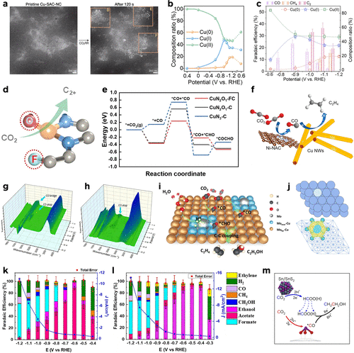 Figure 10. (a) Low magnification EC-STEM images of pristine-SAC and Cu nanograins after the CO2RR for 120 s in liquids. Reproduced from ref (80). Copyright 2025, American Chemical Society. (b) Linear combination fitting of Cu oxidation states for CuPc-F. (c) Cu composition ratio and FEs of various products at multiple potentials for CuPc-F. Reproduced from ref (82). Copyright 2025, American Chemical Society. (d) F, O-codrived local coordination environment optimized for CuFONC favors the CO2RR toward C2+. (e) The reaction pathways of CO2 to *COCHO on CuN2O1–FC, CuN2O1–C, and CuN3–C. Reproduced from ref (121). Copyright 2024, Wiley-VCH. (f) Schematic illustration of the modular design of the Cu/Ni-NAC hybrid catalyst for tandem catalysis. In-situ SEIRAS spectra of (g) the Cu/Ni-NAC and (h) the Cu NW catalysts under ECR conditions. Reproduced from ref (95). Copyright 2022, American Chemical Society. (i) A proposed reaction mechanism for the CO2RR to C2H4 and C2H5OH. Reproduced from ref (144). Copyright 2025, Wiley-VCH. (j) Simulated geometry and charge density difference of M1/Cu(111). Reproduced from ref (68). Copyright 2025, Springer Nature. FEs and the product distributions under different polarization potentials over (k) Sn/C-0.12 and (l) Sn/C-1.2 (stacked bar chart) and the geometric partial current densities, J, toward (k) acetate and (l) ethanol (blue line-stars). All FEs are calculated from chronoamperometry measurements. Reproduced from ref (161). Copyright 2024, American Chemical Society. (m) A schematic illustration showing the cascade reaction during CO2 reduction to ethanol over SnS2/Sn1–O3G (gray: S, red: O, yellow: H and purple: Sn). Reproduced from ref (157). Copyright 2023, Springer Nature.
