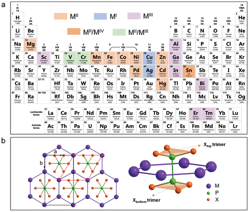 Figure 1. (a) The metal atoms and their valence states constituted in MPX3 crystals across the periodic table of elements. Filled blocks represent elements for which the layered MPX3 structure has been reported. (b) Schematic structure of MPX3 with [P2X6]4- bipyramids enclosing the metal atoms. The X layers are distinguished through Xtop and Xbottom.Figure 2