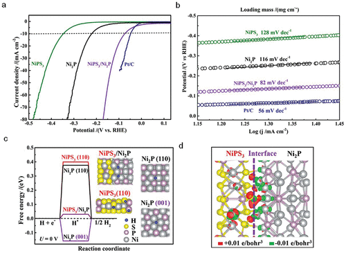 Figure 6. Electrocatalytic HER activity on NiPS3/Ni2P electrode. a-b) Comparison of the linear sweep voltammetry profiles (a) and the corresponding Tafel plots (b) for the as-grown NiPS3, Ni2P, NiPS3/Ni2P electrodes. c) the Gibbs energy profile for H adsorption (ΔGH*) obtained at the equilibrium potential (U = 0 V) for the as-grown NiPS3/Ni2P, Ni2P (001), Ni2P (110), and NiPS3 (110). d) Charge density difference at the heterointerfaces between NiPS3 and Ni2P. The electron accumulation and depletion are marked with red and green, respectively. The grey, yellow, purple, and blue colors represent Ni, S, P, and H atoms, which are marked in, respectively.Reproduced with permission from ref ( 57). Copyright 2019, American Chemical Society.Figure 7