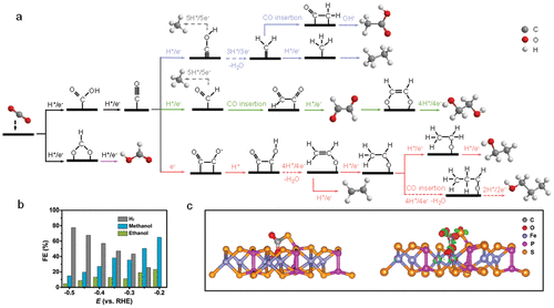 Figure 7. (a) Overview of the primary pathways for CO2RR towards different products. b-c) Electrocatalytic CO2RR for different products at different potentials over Fe2P2S6 nanosheets (b), and optimized adsorption of CO2 molecular over Fe2P2S6 surface (c), in which red and blue regions represent positive and negative charges, respectively.Reproduced with permission from ref ( 65). Copyright 2019, American Chemical Society.Figure 8