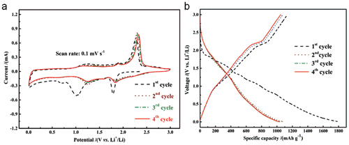 Figure 9. Electrochemical performance of NiPS3 nanosheet electrode used for Li-ion battery. (a) Cyclic voltammetric curves for the first four cycles at 0.1 mV/s. (b) The representative galvanostatic charge-discharge profiles for the four cycles at 0.05 A/g.Reproduced with permission from ref ( 74). Copyright 2017, Wiley-VCH.Figure 10