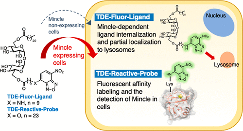 Mincle, a member of the C-type lectin receptor (CLR) family, detects various glycolipids and glycerolipids such as trehalose dimycolate (TDM) from Mycobacterium tuberculosis, leading to the activation of the innate immune system. In this study, we developed new fluorescence-labeled molecular probes, TDE-Fluor-Ligand and TDE-Reactive-Probe, based on the structure of trehalose diester to elucidate the intracellular behavior of Mincle and its ligands. TDE-Fluor-Ligand was prepared for the ligand analysis, and TDE-Reactive-Probe was specifically designed to label Mincle by turn-on fluorescent affinity labeling. Live-cell imaging analysis using these probes revealed that TDE-Fluor-Ligand internalizes into the cell in a Mincle-dependent manner. Furthermore, imaging analysis using TDE-Reactive-Probe successfully detected Mincle in cells in a Mincle expression-dependent manner.