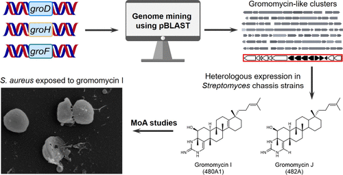 The growing threat of multidrug-resistant bacterial infections highlights the urgent need for antibiotics with novel mechanisms of action. Gromomycins, a newly identified class of triterpene antibiotics, exhibit potent activity against Gram-positive bacteria, including drug-resistant species, through a previously uncharacterized mode of action. Here, we report the discovery of a gromomycin-like biosynthetic gene cluster in the Actinoplanes genus through a genome mining approach, leading to the isolation and characterization of new bioactive derivatives that overcome resistance to clinically used drugs in vancomycin-resistant enterococci. Mechanistic studies revealed that gromomycins induce rapid potassium ion leakage and depolarization of the bacterial membrane, resulting in bactericidal activity against Staphylococcus aureus. Gromomycins disrupt the integrity of the cytoplasmic membrane, as evidenced by large pore formation, leakage of intracellular contents, and subsequent cell lysis. Supplementation with membrane lipids and fatty acids neutralized their antibacterial activity, suggesting a direct membrane-targeting mechanism, further supported by the inability to raise gromomycin resistance and their toxic effects on eukaryotic cells. Collectively, these findings deepen our understanding of gromomycin activity and demonstrate the utility of genome mining to uncover structurally novel and biologically active natural products.