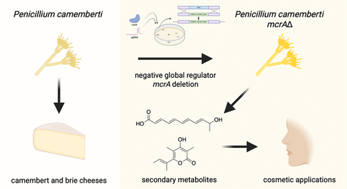 Fungal secondary metabolites have historically provided important applications in a variety of industries. Penicillium camemberti, a fungus with a role in cheese production, was domesticated to food use partly due to its metabolically depleted characteristic, minimizing the risk of toxic compound formation. However, antiSMASH analysis of the genome reveals that strains of the species do contain various cryptic biosynthetic gene clusters and, thus, have the potential capability of producing multiple secondary metabolites despite its limited compound production under normal laboratory conditions. Here, we genetically engineered Penicillium camemberti strain IMV00769, which is genetically similar to cheese-making isolates, by deleting negative global regulator, mcrA. This deletion resulted in the production of secondary metabolites not previously produced by this strain, including fumigermin, a compound patented for cosmetic applications for the reduction of skin wrinkles, enhancement of skin elasticity, and skin whitening. Our findings highlight the power of global regulator manipulation to activate cryptic biosynthetic pathways and expand the range of natural products accessible from domesticated fungal strains.