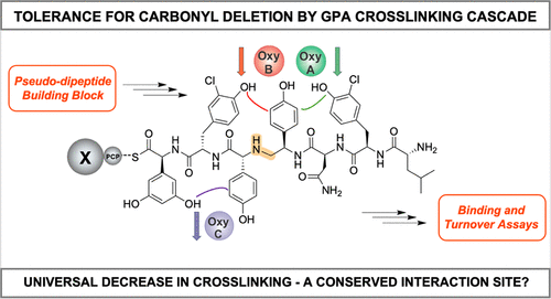 Glycopeptide antibiotics (GPAs) are clinically important antibiotics characterized by a rigid, highly cross-linked structure. The cross-links in GPAs are installed by the activity of several cytochrome P450 (Oxy) enzymes, which are recruited to their peptide substrates by a unique domain, the X-domain. Given that this cross-linking cascade is the source of both the antibiotic activity and the synthetic complexity of GPAs, it remains a central point for exploring the tolerance of the Oxy enzymes for altered peptide substrates. In this study, we have investigated the ability of the Oxy enzymes to cross-link peptides with changes to their amide backbone, specifically a [Ψ[CH2NH]Tpg] methylene linkage that was inspired by synthetic efforts showing that such analogues can recover antibiotic activity toward resistant bacteria. Our results show that the Oxy enzymes are extremely sensitive to the presence of a methylene linkage in their peptide substrates, which suggests that these backbone carbonyl groups play a crucial role in maintaining the correct binding of peptide substrates to the P450 enzymes within the GPA cross-linking cascade.