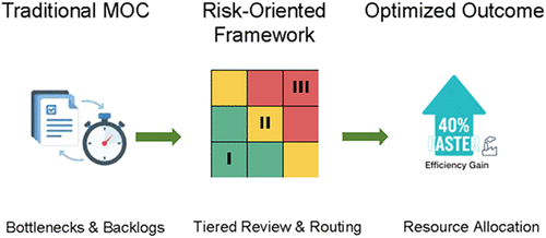 Management of Change (MOC) is a critical element of Process Safety Management (PSM), yet conventional programs often struggle with high review workloads, limited resources, and slow approval cycles. The prevailing “apply-all” approach can create backlogs, dilute attention to high-risk modifications, and gradually erode confidence in the program’s safety value. This paper proposes a risk-based MOC framework to screen, prioritize, and route changes toward appropriate levels of technical review for petrochemical operations that improves efficiency while maintaining program integrity. The approach introduces an exemption review mechanism and a risk-based classification system to allocate resources toward high-consequence changes, supported by key performance indicators to enable monitoring and continuous improvement. The method is demonstrated through three industrial case studies, and a statistical analysis of historical records quantifies tangible benefits. After implementation, average MOC processing time was reduced by 40%, without compromising process safety. The results illustrate how structured screening, prioritization, and performance tracking can strengthen chemical safety outcomes while enhancing operational efficiency.