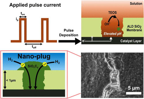 Zero-gap electrolyzers based on submicron thick proton-conducting oxide membranes (POMs) represent a promising approach to increasing the efficiency of H2 production from water electrolysis while moving away from conventional perfluorosulfonic acid (PFSA) membranes. A critical barrier to the commercialization of such electrolyzers is that the ultrathin nature of POMs, which is necessary to achieve low cell resistance, makes them more susceptible to defects that can lead to unacceptably high rates of H2 crossover. Herein, we demonstrate an approach to mitigate this problem through selective deposition of carbon-containing silicon oxide (SiOxCy) “nanoplugs” into the defects of submicron thick SiO2 membranes using a facile electrochemically mediated deposition process. Selective deposition of nanoplugs within the defects was verified by multiple characterization techniques, while scanning electrochemical microscopy (SECM) was used to confirm selective plugging of H2-crossover hotspots associated with defects at identical locations. Thanks to the use of nanoplugs, the H2 permeance of 250 nm thick SiO2 membranes was reduced by 5 to 6 orders of magnitude compared to the unmodified atomic layer deposition (ALD) SiO2 membranes while having negligible impact on the ionic resistance of the membrane. These plug-modified membranes also enabled safe and stable operation of a zero-gap full cell electrolysis cell, in contrast to cells lacking nanoplugs that produced anode effluent streams having H2 concentrations near or exceeding the lower flammability limit (LFL) of H2. Beyond water electrolysis, this defect-sealing strategy has the potential to be broadly implemented in other applications, such as fuel cells and flow batteries, offering a versatile solution to mitigate crossover-related performance losses.
