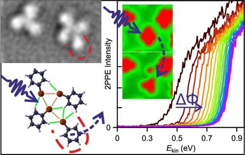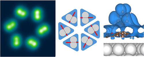 We investigated trioxatriangulenium functionalized with phenyl (phenyl-TOTA) on the (111) surfaces of Ag and Au using low-temperature scanning tunneling microscopy (STM) and density functional theory (DFT). On Ag(111), the molecules form hexagonal arrays, and on Au(111), honeycomb patterns are also observed. The orientations of the phenyl moieties are resolved on both substrates. On Ag(111), the orientations are parallel within a row and they differ by approximately 60° between adjacent molecular rows, and STM images suggest dimerization of the molecules. DFT calculations for Ag(111) reveal that van der Waals interactions dominate this system. The optimized structure matches the experimental pattern, and the simulated STM images exhibit apparent dimerization. The dimerization results from an asymmetry of the phenyl wave function, which reflects intramolecular hydrogen bonding between the ligand and an oxygen atom within the triangulenium platform. The orientation of the phenyl moieties is explained by the interaction of each phenyl subunit with its triangulenium platform combined with the direct long-range interaction between phenyl moieties across molecules.
