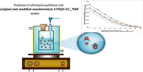To measure the solubility of KCl, NaCl, Na2SO4, and K2SO4 through a methodical-analytical approach, a simple and accurate apparatus is applied. The solubility of these salt types is measured in H2O and CH3OH at 278.15 and 288.15 K. The nonelectrolyte UNIQUAC-NRF and modified nonelectrolyte UNIQUAC-NRF models are developed to correlate the salt solubility data based on the excess Gibbs free energy. In these models, the composition of short-range interaction and long-range contribution is represented through the local composition model and a Pitzer–Debye–Hückel equation, respectively. Each one of these two models has two binary adjustable parameters, which are obtained by fitting the experimental solubility data of the water–methanol–salt mixtures at 278.15 and 288.15 K. The adjustment of the parameters is essential in predicting the solubility of the salt types for H2O–CH3OH–salt mixtures at electrolyte concentrations up to the saturation point and temperatures within 283.15 to 328.15 K. The findings here indicate that these two models can accurately describe salt solubility in water–methanol–salt mixtures, only through the binary adjustable parameters.