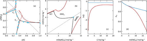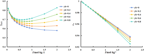The mean activity coefficients of KCl (γ±KCl) in LiCl–KCl–H2O mixed salt solutions were investigated at 273.15 K by the cell potential method, and the cell potential value of a KCl–H2O solution, the standard potential value E0, and electrode response slope κ were obtained. The results indicated the ion selective electrodes have a good Nernst response. The mean activity coefficients of KCl (γ±KCl) in LiCl–KCl–H2O mixed salt solutions were determined, the total ionic strength I ranged from 0.0500 to 2.0000 mol·kg–1, and the ionic strength fractions yb of LiCl were 0.8, 0.6, 0.4, 0.2, and 0.0. The LiCl single salt parameters of the Pitzer model β(0), β(1), CΦ, and Pitzer mixed ion interaction parameters θK,Li, ψK+,Li+,Cl– for the ternary system at 273.15 K were fitted by the Pitzer model. The related thermodynamic properties, including the mean activity coefficients of LiCl (γ±LiCl), water activity (aw), osmotic coefficients (Φ), and excess Gibbs free energy (GE) were calculated. Moreover, the phase equilibrium predictions were in good accordance with the experimental values, which means that the fitted parameters have good applicability.
