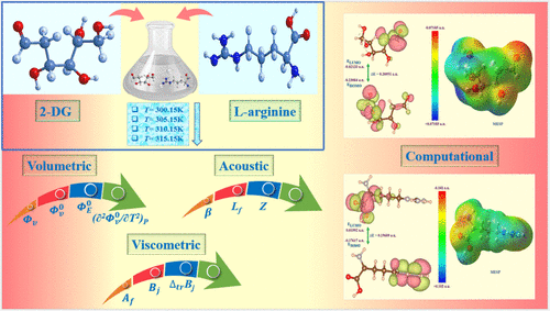 The interactions between drugs and biologically active compounds have attracted significant attention due to their importance in the pharmacological and biological fields. Thus, current research is undertaken to investigate the molecular interaction between the COVID-19 drug 2-deoxy-d-glucose (2-DG) and l-arginine in an aqueous medium using experimental and computational methods. Experimental studies include the measurements of the thermophysical properties for 2-DG (0.001–0.010) mol·kg–1 in water and aqueous l-arginine (0.01) mol·kg–1 solution at four equidistant temperatures (T = 300.15–315.15 K) under barometric pressure (P = 101.3 kPa). The experimentally determined densities (ρ) and sound velocities (u) were used to evaluate the various thermoacoustic parameters. Moreover, the activation energy (Eη) and activation parameters, Δμ10#, Δμ20#, ΔH20#, and ΔS20# have also been evaluated by using transition state theory. The temperature and concentration dependencies of the evaluated parameters were estimated in terms of the structural behavior of 2-DG and its molecular interactions prevailing in an aqueous solution of l-arginine. The UV-spectral and DFT studies have been carried out to support thermophysical outcomes. The experimental results could be helpful in predicting the pharmacokinetic and pharmacodynamic action of the drug in the human body.