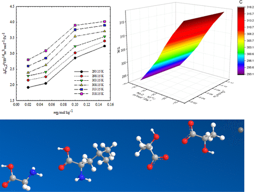 The hydration behavior of glycine and L-leucine was examined in aqueous solutions of calcium lactate. The experiments were accomplished at atmospheric pressure across a temperature range from 293.15 to 318.15 K, emphasizing the nature of solute–solvent interactions. The volumetric properties were estimated by employing experimentally measured density and speed of sound results. The interactions between leucine or glycine and calcium lactate were analyzed by using the values of apparent molar volume, apparent molar isentropic compressibility, infinite dilution partial molar volume, and volume of transfer. The volumetric transfer parameters were determined and analyzed using the cosphere overlap model. Among all of the interactions present in the system, hydrophilic interactions were found to be the most dominant. These interactions were more pronounced in the case of glycine compared to leucine. The positive contribution to the volume may be attributed to the interaction between calcium ions and the carbonyl or amino groups of the amino acids. Additionally, the hydrophobic lactate group of calcium lactate may engage in hydrophobic interactions with the nonpolar regions of the amino acids in aqueous solution. However, the hydrophilic interactions significantly outweigh the hydrophobic contributions.