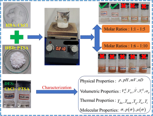 In this work, p-toluene sulfonic acid (PTSA)-based deep eutectic solvents (DESs) were prepared at different mole ratios (DESs: 1:1, 1:2, 1:3, 1:4, 1:5, 1:6, 1:7, 1:8, 1:9, and 1:10) by mixing of choline chloride (ChCl) and PTSA. Among them, 1:1 (DES1) and 1:2 (DES2) molar ratios show a clear and homogeneous liquid, even after 24 h. The density of DES1 and DES2 was measured at temperatures from 298.15 to 343.15 K and 101.305 kPa. The refractive index (nD) of DES1 and DES2 was measured at 298.15 K and 101.305 kPa. The density of DES1 + water and DES2 + water mixtures over the whole mole fractions was measured at temperatures from 298.15 to 343.15 K and 101.305 kPa. The refractive index of DES1 and DES2 with water over the whole mole fractions was measured at 298.15 K and 101.305 kPa. From the measured density data, the excess molar volume (VmE), apparent molar volume (Vφi), partial molar volume ((V¯l)), excess partial molar volume (V¯iE), and coefficient of isobaric expansion (αP) at constant pressure were calculated. The formation of DES was confirmed through FTIR spectra, 1H NMR spectra, and 13C spectra. Further, the thermal stability and thermal behavior of all the prepared DESs were determined using TG-DSC thermogram.