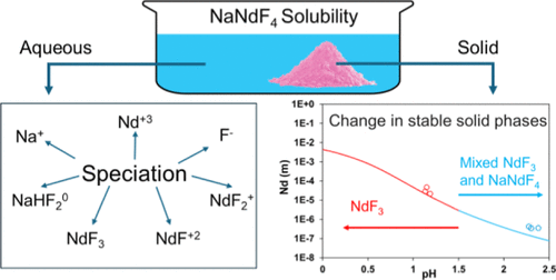 A thermodynamic model has been developed for calculating solubilities and speciation in aqueous Nd–Na–F–H2O systems. The model combines experimental data from the literature for NdF3 and NaF in aqueous environments with new measurements of the solubility of both NdF3 and NaNdF4 as a function of pH at room temperature. For NaNdF4, the solubility data complement the recently reported solid state property data, thus establishing a comprehensive database for this hitherto poorly characterized compound. The solubilities of NdF3 and NaNdF4 have been measured through the dissolution method in HCl (0.1, 0.01 mol·kg–1 H2O) solutions at target pH of ∼1 and ∼2 over an equilibration period of up to 12 weeks at room temperature. The composition of the solution phase was determined through Inductively Coupled Plasma–Optical Emission Spectrometry. X-ray diffraction was performed to determine the remaining equilibrated solid phases. For modeling, the Mixed-Solvent Electrolyte framework has been used, which was previously parametrized and validated for various rare earth systems. The model combines a comprehensive speciation treatment in the aqueous phase with solid-state thermodynamics to reproduce the solubility of solids at varying processes conditions, thus providing a foundation for designing novel processes.