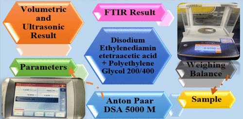 An effective and nondestructive method for examining the complex molecular interactions and structural alterations taking place in liquid systems involves the use of ultrasonic and volumetric measurements. Ultrasonic techniques were used in this investigation because of their remarkable sensitivity to intermolecular forces, solute–solvent interactions, and microstructural changes. This study examines the physicochemical properties, including density (ρ) and sound speed (c), for various compositions of Polyethylene Glycols (PEG 200/400) in water and mixed aqueous disodium ethylenediaminetetraacetic acid (EDTA) solvent media across four temperatures ranging from 288.15 to 318.15 K under ambient pressure (0.1 MPa). The collected empirical data were used to calculate various volumetric and acoustic parameters, including apparent molar parameters (Vϕ, Kϕ,s), partial molar parameters (Vϕ0, Kϕ,s0), transfer parameters (Vϕ,tr0, Kϕ,s,tr0), isobaric thermal expansion (α), and pair and triplet interaction coefficients (VAB, KAB, VABB, KABB). The temperature derivative (∂Vϕ0∂T) was used to explore the solute’s structure-making ability. The quality of taste was determined from the apparent specific volume (vϕ) at (288.15 to 318.15) K. The cosphere overlap model was applied to understand the intermolecular interactions within the mixture. FT-IR spectra of the aqueous solution were recorded with spectral analysis indicating strong intermolecular interactions.