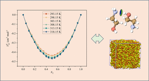 n-Propanol and monoethanolamine are widely used organic solvents and reaction media in the chemical industry. This work reports rigorous thermodynamic data, including density, speed of sound, and refractive index for the binary n-propanol + monoethanolamine system at 0.1 MPa and temperatures ranging from 293.15 to 318.15 K. Excess properties, such as excess molar volume, excess speed of sound, excess isentropic compressibility, and excess refractive index, were calculated to elucidate the system’s thermodynamic behavior and the nature of intermolecular interactions. Molecular dynamics simulations and quantum mechanical calculations combined with 1H NMR and IR spectra reveal that complex hydrogen bonding between the hydroxyl group of n-propanol and the amino/hydroxyl groups of monoethanolamine, coupled with van der Waals forces, drives significant nonideal behavior in the mixture. This study provides reliable thermodynamic data and theoretical insights for optimizing solvent formulations, chemical processes, and design strategies involving n-propanol and monoethanolamine, thereby facilitating technological advancements in related fields.