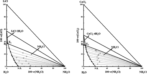 Based on the characteristics of oilfield waters in the Nanyi Mountain area of western Qaidam basin at subzero temperature, the solid–liquid phase equilibria of ternary systems NH4Cl–LiCl–H2O and NH4Cl–CaCl2–H2O at 258.15 K were investigated by using an isothermal solution equilibrium method. The phase diagrams of ternary systems NH4Cl–LiCl–H2O and NH4Cl–CaCl2–H2O at 258.15 K were plotted, respectively. The results show that the equilibrium phase diagram of the ternary system NH4Cl–LiCl–H2O at 258.15 K has one invariant point, two univariate curves, and two solid-phase crystallization zones (NH4Cl and LiCl·2H2O), belonging to hydrate type I. In the equilibrium phase diagram of the ternary system NH4Cl–CaCl2–H2O at 258.15 K, there are one invariant point, two univariate curves, and two solid-phase crystallization zones (NH4Cl and CaCl2·6H2O). In addition, the unreported Pitzer parameters were obtained based on the solubility data of the ternary systems. Using the Pitzer model, the solubilities of salts in the ternary systems NH4Cl–LiCl–H2O and NH4Cl–CaCl2–H2O at 258.15 K were modeled in detail. The modeling solubilities are in great agreement with the experimental results, indicating that the Pitzer model can be well applied to study the thermodynamic phase equilibria at subzero temperature.