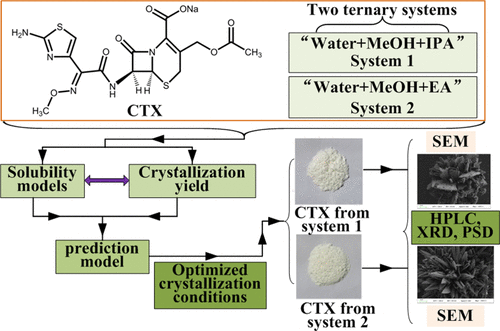 In this study, the solubility of cefotaxime sodium (CTX) in two new ternary systems of “water+methanol(MeOH)+isopropanol(IPA)” and “water+MeOH+ethyl acetate(EA)” at various temperatures was determined and represented using the CNIBS/Redlich–Kister model. In the first ternary system, the mean relative deviation percentages (MRDs%) were 2.6, 6.6, 6.1, and 6.2% for the CTX solubility at temperatures of 278.2, 283.2, 288.2, and 293.2 K, respectively. The MRDs% were 5.9, 7.2, 7.8, and 8.9% for the CTX solubility in the second system. It was concluded that the model used adequately predicted the CTX solubility in two new ternary systems. In addition, the apparent thermodynamic properties of the dissolution process indicated that the CTX dissolution process is endothermic and enthalpy-driven. Furthermore, the solvent amounts for crystallization processes in two ternary systems were optimized based on the obtained solubility model, and the overall MRDs% between the experimental and predicted yields in two systems were 4.0 and 6.7% at 278.2 K. The solvent amounts of the crystallization process were effectively optimized based on the predictions of reliable solubility models. Finally, the solid powders of CTX from two optimized crystallization systems were analyzed by powder X-ray diffraction (XRD), particle size detector (PSD), and scanning electron microscopy (SEM).