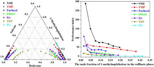 In order to reduce the impact of nitrogen-containing compounds in oil products on the environment, this paper selected n-heptane as the oil product model and pyridine as the nitrogen-containing compound. Four inexpensive extractants (furfuryl alcohol, 1,4-butanediol, N,N-dimethylacetamide, and dimethyl sulfoxide) were selected as the extractants to separate pyridine from the oil model at 303.2 K, and the liquid–liquid equilibrium (LLE) data were measured. The partition coefficients (D) and separation coefficients (S) of the extractants were calculated and used to evaluate the extractants. Based on the LLE data, correlations were performed using NRTL and UNIQUAC models, and the interaction parameters of the corresponding optimization models were obtained. The root-mean-square deviation (RMSD) values of the NRTL and UNIQUAC models were 0.98% and 1.09%, respectively. The GUI-MATLAB tool was selected to evaluate the accuracy of the binary interaction parameter regression by a Gibbs energy topology analysis. To probe the underlying mechanism of the extraction process between the extractants and pyridine, the σ-profile was used to analyze the interaction patterns between the extractants and pyridine. Given their high extraction efficiency, the studied extractants can be considered as potential extractants for extractive denitrification processes.