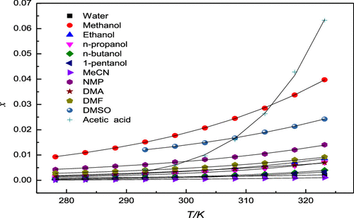 In the study, the experiment solubility of difenidol hydrochloride was determined in 12 neat solvents [water, methanol, ethanol, n-propanol, n-butanol, 1-pentanol, N-methyl-2-pyrrolidone(NMP), N,N-dimethylformamide(DMF), N,N-dimethylacetamide (DMA), dimethyl sulfoxide (DMSO), acetonitrile (MeCN), and acetic acid] at a temperature range from 278.15 to 323.15 K by a gravimetric method under 0.1 MPa. Results indicated that the experimental mole fraction solubility (10x) order of difenidol hydrochloride in 12 neat solvents at the temperature 298.15 K was: methanol(0.1771)>DMSO(0.1343)>NMP(0.0725)>acetic acid (0.0601)>DMF(0.0467)>DMA(0.0357)>ethanol (0.0336)>n-propanol (0.0255)>n-butanol (0.0137)≈water (0.0135)>1-pentanol (0.0098)>MeCN (0.0041), and solubility increased with the increase in temperature. Three models, including Modified Apelblat model, Van’ t Hoff model, and Yaws model, were applied to correlate the experimental data and analyze the solubility data of difenidol hydrochloride. Based on the principle of similar compatibility, the law of solubility and miscibility of difenidol hydrochloride in selected solvents was discussed according to Hansen solubility parameters (HSP) and solvent effect for predicting solubility behavior.