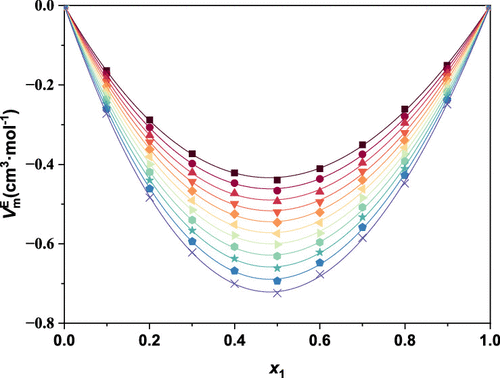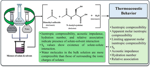 The potential molecular interactions among N-acetyl-l-cysteine (NAC), water (H2O), dimethyl sulfoxide (DMSO), and aqueous dimethyl sulfoxide (DMSO-H2O) were investigated from the experimental speed of sound (c) and density values (ρ) over the temperature range from 298.15 to 318.15 K and at atmospheric pressure. The acoustic parameters, viz., isentropic compressibility (κs), apparent molar isentropic compressibility (κs,ϕ), limiting apparent molar isentropic compressibility (κs,ϕ0), Sk, acoustic impedance (Z), hydration number (NH), and relative association (RA), were determined using experimental sound velocities. The results were interpreted in terms of possible solute–solute and solute–solvent interactions. Negative κs,ϕ values identifying molecules of water in the bulk solution seemed to be more compressible than those surrounding the ionic charges of the solute. κs, κs,ϕ0, and Z values indicate the presence of solute–solvent interaction, whereas Sk values specify that solute–solute interaction is also present in the studied system.