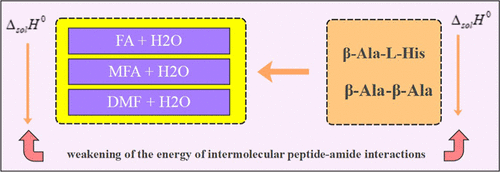 This paper presents, for the first time, the standard values of the enthalpies of β-alanyl-l-histidine (β-Ala-L-His) dissolution (ΔsolH0) in the binary solvents water + (formamide, N-methylformamide, and N,N-dimethylformamide) at T = 298.15 K, obtained calorimetrically. Various parameters such as solvation enthalpies, (ΔsolvH0), transfer enthalpies, (ΔtrH0) and the enthalpic coefficients of pairwise interactions (hxy) were calculated from these values. The obtained data were compared with similar data for β-alanyl-β–alanine (β-Ala-β-Ala). A similar character of solvation of both peptides in mixtures of the same name has been established. This is evidenced by the linear relationship between the enthalpic coefficients of the pairwise interactions of both peptides. The solvation of peptides is weakened in the series of mixed solvents (H2O + FA) < (H2O + NMF) < (H2O + DMF), which is associated with an increase in the hydrophobic properties of the formamides and an increase in the intermolecular interactions in the mixtures themselves in the same order. However, β-Ala-L-His is more strongly solvated than β-Ala-β-Ala. This is due to the presence of specific solvation centers in the side chain of β-Ala-L-His.