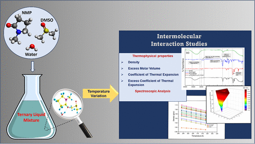 This study investigates the thermodynamic and molecular interaction properties of the N-Methyl-2-pyrrolidone (NMP), Dimethyl sulfoxide (DMSO), and water ternary system across a range of compositions and temperatures (293.15–318.15 K). Densities were measured for 19 different compositions, from which excess molar volumes (VmE) and excess coefficients of thermal expansion (αPE) were calculated to quantify deviations from an ideal mixing behavior. All compositions exhibited negative VmE values, indicating a significant volume contraction due to strong intermolecular interactions. Fourier-transform infrared (FTIR) spectroscopy confirmed the presence of enhanced hydrogen-bonding networks between water and the organic solvents. Temperature dependence studies revealed that while thermal energy partially disrupts these interactions, the structured domains persist throughout the temperature range studied. The positive αPE values indicate that the mixture’s thermal expansion exceeds predictions based on ideal mixing, highlighting the system’s sensitivity to thermal perturbation. These findings provide valuable insights for optimizing NMP–DMSO–water mixtures in applications, including chemical synthesis, pharmaceutical formulations, polymer processing, and extraction technologies.