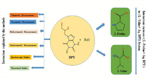 The comparative molecular interaction between a biologically potent drug molecule, dyphylline, and two essential amino acids, l-proline and l-valine, has been studied in an aqueous medium using physicochemical methodologies at 303.15, 308.15, and 313.15 K at 0.1 MPa atmospheric pressure. The methodologies engaged herein (density, refractive index, viscosity, and surface tension) recognized the presence of the molecular interaction of dyphylline with the amino acids. Different parameters like “apparent molar volumes” (ϕv), “partial molar volumes at infinite dilution” (ϕv0), “limiting apparent molar expansibilities” (ϕE0), transfer properties (Δtrφv0), “isobaric thermal expansion coefficient” (α), viscosity B-coefficients, hydration number (nH), and thermodynamic parameters (Δμ10≠, Δμ20≠, TΔS20≠, and ΔH20≠) of viscous flow obtained from density and viscosity measurements are also used for molecular interaction determination. 1H and 13C NMR spectroscopic study shows significant evidence for the presence of the solute–cosolvent interaction in solution. The interaction between the molecules has been discussed in the context of the structure-breaking/structure-making ability of the molecules in solution. The thermodynamic background of their interaction in aqueous solution has also been explored with the help of density and viscosity measurements. DFT studies construct the theoretical basis of the interaction between the components in solution.