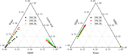 In the traditional lactic acid ester synthesis process, lactic acid and 4-methyl-2-pentanol (MIBC) under certain temperature and acidic conditions undergo an esterification reaction to produce 2-hydroxypropanoic acid-1,3-dimethylbutyl ester (DIHP) and water, forming a complex system containing lactic acid, MIBC, DIHP, and water. To investigate the mutual solubility of the substances in the system, the ternary liquid–liquid equilibrium (LLE) data for DIHP + lactic acid + water and water + MIBC + DIHP were determined at 288.2–308.2 K and 101.3 kPa in this paper. The measured experimental data were correlated with nonrandom two-liquid (NRTL) and universal quasi-chemical (UNIQUAC) models to obtain the binary interaction parameters between substances. In addition, parameter rationality was evaluated by using the GUI-MATLAB tool, and the conclusions indicated that these parameters were reliable. This will provide critical and reliable fundamental data points for constructing a more complete thermodynamic model that predicts the phase behavior of the quaternary system. Finally, this paper reveals the interaction mechanism between the substances at the microscopic level by combining the experimental results with quantum chemical calculations, which, in turn, reflect the solvation effects between the substances.