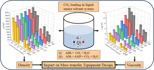 Removal of CO2 from industrial exhaust gas is vital and is commonly achieved by using chemical absorption with newly formulated solvents. The density and viscosity of carbonated solutions are critical physicochemical properties for selecting an efficient solvent in the CO2 absorption processes. In this work, aqueous bis(3-aminopropyl)amine (APA) and its mixture with 2-amino-2-methyl-1-propanol (AMP) are considered to be promising absorbents for the CO2 capture process. New experimental density and viscosity data for CO2-loaded APA and APA + AMP mixtures were determined over a temperature range of 303.25–328.25 K and different CO2 concentrations pertaining to the gas absorption condition. The density and viscosity of the CO2-loaded APA and APA-AMP solvent systems were correlated using thermodynamics models, with parameters determined for different aqueous carbonated solvent compositions across the studied temperature range. The modeling results show that the percentage average absolute deviations (% AADs) between the experimental and model results of density were 0.03 for the ternary system (APA + H2O + CO2) and 0.13 for the quaternary system (APA + AMP + H2O + CO2). The % AADs between experimental and model viscosity data are 0.88 and 2.97, respectively. The obtained results provide valuable insights into the development of amine-based solvents for efficient CO2 capture applications.