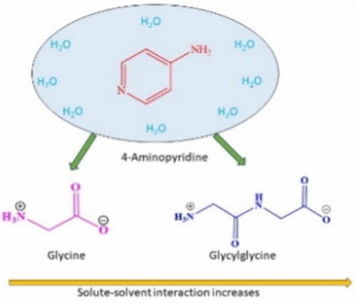 In the present investigation, aqueous solutions of 4-aminopyridine (4-AP) at molalities of 0.001, 0.003, and 0.005 mol·kg–1 were utilized as solvent media to explore the physicochemical properties of the amino acids (AAs) glycine and glycylglycine across a temperature span of 293.15 to 313.15 K under ambient pressure. Experimental determinations of density and viscosity facilitated the evaluation of critical thermodynamic and transport parameters, including apparent molar volumes (Vϕ), limiting partial molar volumes (Vϕ0), transfer volumes (ΔtrVϕ0), Jones–Dole viscosity B-coefficients, and the activation free energies for viscous flow (Δμ10# and Δμ20#), interpreted through the framework of Transition State Theory. The obtained data indicated stronger intensification of solute–solvent interactions with increasing concentrations of 4-AP, consistent with the Co-sphere Overlap Model. Both glycine and glycylglycine were found to exhibit structure-disrupting effects on the aqueous medium in the presence of 4-AP, suggesting a perturbation of the inherent water structure. Complementary fluorescence spectroscopic analysis, through systematic variation in AA concentration, enabled the estimation of association constants, while 1H NMR spectroscopy provided insights into the presence of hydrophobic interactions between 4-AP and the AAs. These experimental insights were further substantiated through computational modeling, offering a coherent and molecular-level perspective on the interaction dynamics governing these systems.