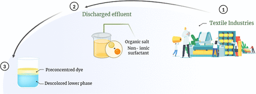 Aqueous two-phase systems (ATPSs) based on nonionic surfactant (Tween 20 or Tween 80) and organic salt (sodium citrate or sodium tartrate) are proposed as alternatives for dye extraction and pretreatment of textile effluents. The newly studied ATPSs exhibited an upper phase rich in surfactant and a lower phase rich in salt. An increase in temperature expanded the biphasic region, altered the phase compositions, and increased the tie-line length. Systems containing citrate exhibited larger biphasic regions due to its higher hydration capacity, while Tween 80 promoted greater phase separation than Tween 20, attributed to its higher hydrophobicity. Partitioning studies with rhodamine B and methyl orange showed preferential dye transference to the surfactant-rich phase, with extraction percentages above 98.7% and 99.2%, respectively. When applied to a textile effluent, the formation of ATPSs using the effluent as solvent led to an expanded immiscibility region in tartrate-based systems. Additionally, color removal efficiency remained above 91.52%, regardless of overall system composition or phase mass ratio, demonstrating the practical feasibility of using these ATPSs for the pretreatment of textile effluents. To the best of our knowledge, this is the first study to evaluate the effect of textile effluent composition on both the formation and dye extraction performance of Tween-based ATPSs.