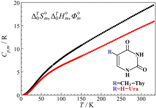 This study reports precise heat capacity data for crystalline thymine (C5H6N2O2; CAS Number: 65-71-4; fraction purity: 0.999) and uracil (C4H4N2O2; CAS Number: 66-22-8; fraction purity: 0.999) over the temperature range of 6 to 330 K. Adiabatic calorimetry was used to perform the measurements. The calorimeter was validated by measuring the heat capacity of reference standards (copper and benzoic acid). The experimental heat capacity data were fitted using Einstein-Planck functions and extrapolated to 0 K following the Debye law. The data enabled the calculation of thermodynamic functions (entropy, enthalpy increment, and reduced Gibbs energy) for thymine and uracil between 0 and 330 K.