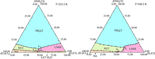 The solid–liquid phase equilibria of the quaternary system Li+, NH4+, Ca2+//Cl––H2O at 323.2 and 348.2 K was investigated using isothermal dissolution method, targeting deep brines rich in ammonium and calcium. Equilibrium liquid-phase composition and density were determined. The solid solution (NH4Cl)x(LiCl·H2O)1–x was confirmed by XRD and TG-DSC. The results show that the quaternary system Li+, NH4+, Ca2+//Cl––H2O at 323.2 and 348.2 K exhibits complex behavior involving the formation of solid solution (NH4Cl)x(LiCl·H2O)1–x and double salt (2NH4Cl·CaCl2·3H2O). The phase diagram of the system at 323.2 K consists of three invariant points, seven univariate curves, and five crystalline phase regions (NH4Cl, LiCl·H2O, 2NH4Cl·CaCl2·3H2O, (NH4Cl)x(LiCl·H2O)1–x, and CaCl2·2H2O). At 348.2 K, it has two invariant points, five univariant curves, and four crystalline regions (NH4Cl, 2NH4Cl·CaCl2·3H2O, (NH4Cl)x(LiCl·H2O)1–x, and CaCl2·2H2O). Comparative analysis of multitemperature phase diagrams of the quaternary system Li+, NH4+, Ca2+//Cl––H2O at 298.2, 323.2, and 348.2 K demonstrates that the crystalline phase region of LiCl·H2O decreases with the increase of temperature. Notably, at 348.2 K, lithium chloride exclusively exists within the (NH4Cl)x(LiCl·H2O)1–x. This thermal behavior suggests that cooling crystallization could be effectively employed for lithium extraction from such brines.