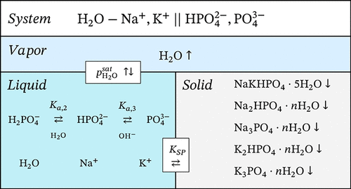 A comprehensive thermodynamic model for aqueous solutions containing sodium and potassium monohydrogen phosphates has been developed based on the Pitzer–Simonson–Clegg formalism for excess properties, the Helgeson–Kirkham–Flowers equation of state for standard-state properties, and the IAPWS formulations for pure water. The model accounts explicitly for acid–base equilibria among H2PO4–, HPO42–, and PO43– species and includes all necessary ion–ion and ion–neutral interactions to accurately describe solution properties over a wide temperature range. Thermodynamic parameters were evaluated using critically selected literature data on osmotic coefficients, water activity, solubility, enthalpies of dilution, and heat capacities. Solubility products of relevant solid phases, including multiple hydrates of Na2HPO4 and K2HPO4, were parametrized. The resulting model reproduces experimental phase equilibria and thermodynamic properties with high accuracy from the crystallization to the boiling point of saturated solutions. The model forms a foundation for the future inclusion of dihydrogen phosphate species and enables the consistent prediction of multicomponent phosphate solution behavior across wide concentration and temperature ranges.