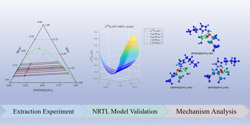 Efficient separation of sec-butanol (SBA) and sec-butyl acetate (SBAC) is important for the sustainability of methyl ethyl ketone (MEK) and its subsequent solvent and pharmaceutical chemical processes. However, SBA and SBAC form a binary azeotrope, which complicates the separation. In this work, three ionic liquids: 1-propyl-3-methylimidazolium dihydrogen phosphate ([PMIM][H2PO4]), 1-butyl-3-methylimidazolium dihydrogen phosphate ([BMIM][H2PO4]), and 1-butyl-3-methylimidazolium hydrosulfate ([BMIM][HSO4]) are screened and employed to separate SBAC and SBA azeotropic mixture using liquid–liquid extraction. Ternary liquid–liquid equilibrium (LLE) data at 303.15 K and atmospheric pressure are determined with distribution coefficients and selectivity evaluated, and data reliability is confirmed via Othmer-Tobias and Hand correlations. The experimental LLE data are correlated by the nonrandom two-liquids (NRTL) model, with the consistency of NRTL model parameters verified through the GMcal_TieLinesLL. The underlying separation mechanism is comprehensively elucidated through QC calculations, with ESP mapping, bond length and interaction energy, IGMH analysis, and QTAIM topological analysis, demonstrating that the interaction between ionic liquids (ILs) and SBA is stronger than the ILs and SBAC, among which hydrogen bond plays a dominant role. The feasibility of industrial-scale application is confirmed by a process flowsheet simulated and optimized with Aspen Plus.