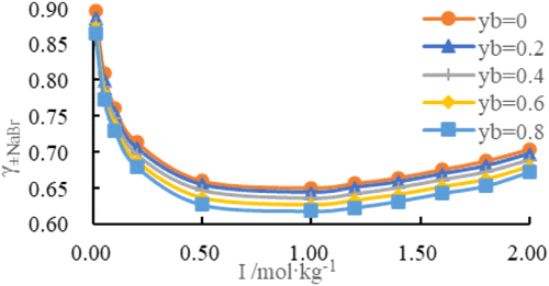 The mean activity coefficients of NaBr in the NaBr–SrBr2–H2O ternary solution at 318.15 K were investigated by using the cell potential method. Sodium- and bromide-selective electrodes were used to measure the cell potentials of the NaBr–H2O solutions. The standard cell potential (E0) and electrode response slope (κ) were derived from these measurements. Subsequently, the mean activity coefficients of NaBr in the NaBr–SrBr2–H2O system were determined for a total ionic strength range of 0.01 to 2.00 mol·kg– 1. The ionic strength fraction of SrBr2 (yb) was set to 0.0, 0.2, 0.4, 0.6, or 0.8. Using mean activity coefficents and the Pitzer model, we used a programming solver to fit the Pitzer ion interaction parameters θNa+,Sr2+ and ψNa+,Sr2+,Br−. The mean activity coefficients of SrBr2, the osmotic coefficient Φ, the water activity aw, and the excess Gibbs free energy GE of the mixed solution were calculated. Additionally, the solubility of the ternary system was modeled using the Pitzer model. The predicted values were compared with experimental data at 308.2 and 323 K, confirming the reliability of the modeled results and the good adaptability of the mixed ion interaction parameters for solubility prediction.