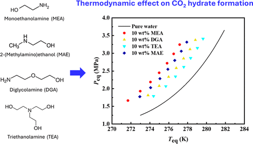 Controlling the formation of carbon dioxide (CO2) hydrate is crucial for CO2 capture, transportation, and storage. Understanding the effects of additives on CO2 hydrate formation is essential for selecting suitable chemicals to ensure flow assurance. This study presents new experimental data on the effects of alkanolamine additives: monoethanolamine (MEA), diglycolamine (DGA), triethanolamine (TEA), and 2-(methylamino)ethanol (MAE) on CO2 hydrate formation. Equilibrium dissociation temperatures and pressures were measured using isochoric and temperature-cycling methods over a temperature range of 272–281 K, pressure range of 1.7–3.4 MPa, and additive concentrations of 5 and 10 wt %. All additives thermodynamically inhibited CO2 hydrate formation, with MEA exhibiting the strongest inhibitory effect. Compared to other thermodynamic hydrate inhibitors (THIs), including amines, alcohols, ionic liquids, and alcohol amine mixtures reported in the literature, MEA demonstrated the highest inhibition strength. Additionally, the Clausius–Clapeyron equation was used to speculate on CO2 hydrate structures, suggesting that the sI CO2 hydrate is generated in the presence of each additive. Furthermore, the Østergaard–Masoudi–Tohidi–Danesh–Todd (ØMTDT) equation was employed to effectively correlate the equilibrium dissociation data of CO2 hydrates in the presence of these additives.