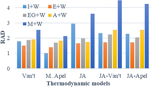 This work explores the liquid–liquid equilibrium (LLE) of a water + methyl lactate (ML) + alkyl alcohol system. The LLE data were acquired for water + ML + (1-hexanol, 1-heptanol, 1-octanol, and 1-nonanol) at a temperature of 303.2 K and a pressure of 101.3 kPa. The system’s equilibrium behavior was characterized by determining water and ML distribution coefficients across the two phases and calculating the separation factor. Moreover, activity coefficient models were utilized to regress the experimental LLE data, with binary interaction parameters subsequently derived. The model parameters were validated with the GMcal_TieLinesLL tool, confirming adherence to Gibbs stability criteria. Additionally, the study encompassed an analysis of intermolecular interactions within the system, employing the σ profile, deformed charge density, interaction energy, and reduced density gradient (RDG) analysis to elucidate the interactions.