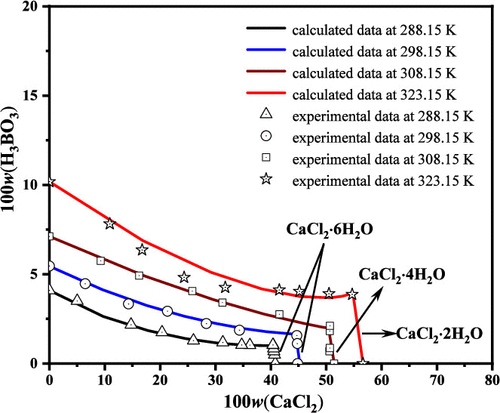 The solid and liquid equilibria in the ternary CaCl2-H3BO3-H2O system at 288.15 and 308.15 K were investigated using the dissolution equilibrium method. The phase diagrams of this system at two temperatures consist of two single-salt crystallization regions corresponding to CaCl2·6H2O and H3BO3 at 288.15 K, CaCl2·4H2O and H3BO3 at 308.15 K, two univariant solubility curves, and one invariant point. A comparison of the phase diagrams at four temperatures shows that the solubilities of H3BO3 and calcium chloride salts increase as the temperature increases. The concentrations of different boron species were calculated with the pH data and the concentration of total boron in the solution. The predominant boron species in the solution is H3BO3 with the mole fraction no less than 0.99. Combining the Pitzer binary parameters of CaCl2, the temperature dependence equations for Pitzer parameters and dissolution equilibrium constant of H3BO3 from 288.15 to 323.15 K were obtained by fitting the solubilities in the ternary system on the basis of Pitzer model. The calculated solubility data at the four temperatures with the Pitzer model agree with the experimental data.