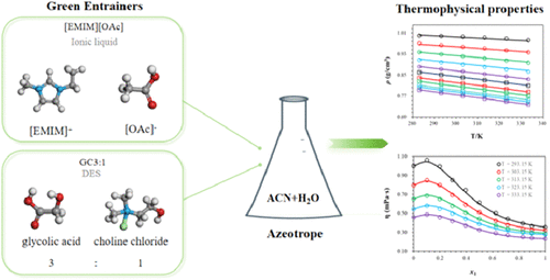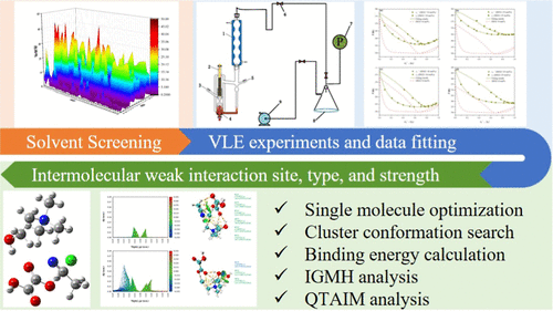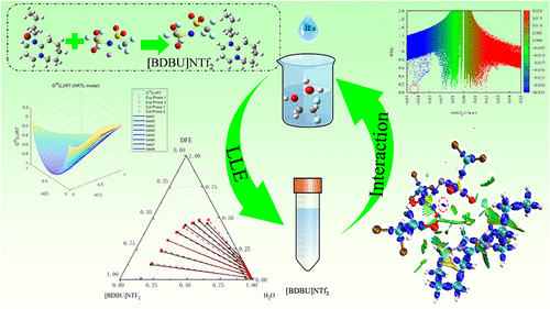 2,2-Difluoroethanol (DFE) is an eco-friendly intermediate, which is employed to produce pharmaceuticals and fluoropolymers. During industrial manufacturing and practical use, an aqueous solution of DFE is usually generated. Owing to the formation of an azeotropic mixture of water and DFE, it is infeasible to separate such an azeotrope by conventional distillation due to its inherent thermodynamic limitations. Thus, extraction is considered for the separation of water and DFE. Three hydrophobic ionic liquids (ILs) {8-butyl-1,8-diazabicyclo [5,4,0]-7-undecene bis (trifluoromethyl sulfonyl) imide ([BDBU]NTf2), 1-butyl-1-methylmorpholinium bis (trifluoromethyl sulfonyl) imide ([BMMor]NTf2), and 1-butylpyridinium bis (trifluoromethyl sulfonyl) imide ([Bpy]NTf2)} were screened using the COSMO-SAC model for separating the azeotropic mixture. The liquid–liquid equilibrium data were ascertained for three mixtures (water + DFE + ILs). The computed data for partition ratio and selectivity of the extractants were employed for assessing their extraction capabilities. The NRTL equation was utilized to regress the obtained experimental data. The consistency of the fitting parameters was further verified. Finally, the intermolecular interactions between DFE/water and the ILs were analyzed and discussed from various perspectives by quantum chemistry calculations, providing a basis for designing rational IL structures to separate the azeotrope.