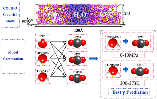 This paper comprehensively compares the performance of different CO2/H2O force fields in predicting interfacial properties. The comparison includes three CO2 molecular models (all rigid) and three H2O molecular models (all rigid). Results show that the TIP4P/2005 model has the smallest deviation in predicting pure water surface tension (γ0). The TIP3P-FB + EPM model combination yields the lowest overall deviation for interfacial tension (γ) prediction over 0–10 MPa at 300 K. Meanwhile, the TIP4P/2005 + EPM2 model combination yields the lowest overall deviation for γ prediction over 300–373 K at 2 MPa. The accuracy of γ is more dependent on the water model used, with the TIP3P-FB water model having the highest weight. These results may be helpful for selecting the appropriate force field to further investigate the kinetics and interfacial properties of CO2/H2O systems.