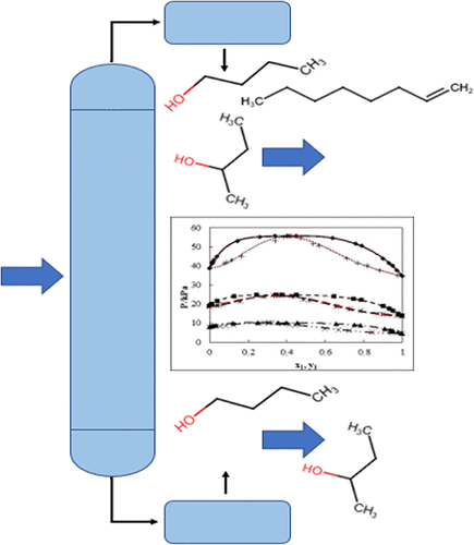 The phase behaviors of alkene-oxygenate mixtures are highly nonideal and not well studied in the literature. To expand the available literature for these systems, isothermal vapor–liquid equilibrium (VLE) data were measured for the butan-1-ol/butan-2-ol + oct-1-ene systems using the dynamic circulation method. The measurements were conducted at three temperatures in the subatmospheric range (T = 333.2, 343.2, 363.2) K, and complex azeotropic behavior was observed. The data were fit using the γ-Φ formulation to the NRTL and UNIQUAC activity coefficient models combined with the virial equation of state using parameters from the Hayden-O’Connell correlation. A temperature-dependent activity coefficient model parameter term was used. The NRTL model combination generally resulted in a superior fit of the VLE data when considering deviations in pressure and vapor composition. This is attributed to the model strength and the additional regressed nonrandomness parameter. The VLE data were found to be thermodynamically consistent according to the Area, Point, and Infinite dilution tests.