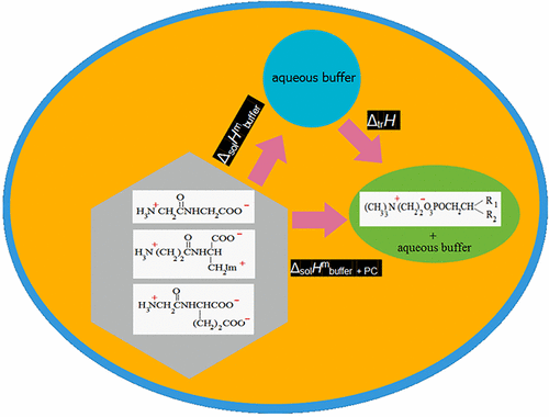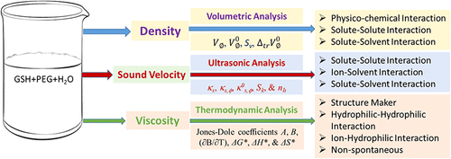 This study systematically investigates the volumetric, ultrasonic, and viscometric properties of glutathione (GSH) and poly(ethylene glycol) (PEG) in aqueous solutions (0.01 to 0.05 mol·kg–1) across a temperature range of 293.15 to 318.15 K. To elucidate molecular interactions, density measurements were used to derive key volumetric parameters, including the limiting apparent molar volume (VØ0) and transfer volume (ΔtrVØ0). Results for GSH in lower concentrations of PEG (0.01 to 0.03 m) indicated a predominance of solute–solute interactions, evidenced by increasing VØ0 and positive experimental slopes (Sv). Conversely, higher PEG concentrations (0.04 to 0.05 m) suggested stronger solute–solvent interactions. Ultrasonic data, including isentropic compressibility (Ks), apparent molar isentropic compressibility (Ks,Ø), and hydration numbers (nh), corroborated the coexistence of these competing forces. Viscometric analysis via Jones–Dole coefficients (A, B) and the temperature derivative (∂B/∂T) identified both solutes as structure makers within the aqueous medium. Finally, thermodynamic activation parameters, namely, Gibbs free energy of activation (ΔG*), enthalpy of activation (ΔH*), and entropy of activation (ΔS*) were calculated to provide a comprehensive profile of the viscous flow and molecular mechanism. These findings offer critical insights into the existing molecular interaction and stability of GSH in the presence of PEG.