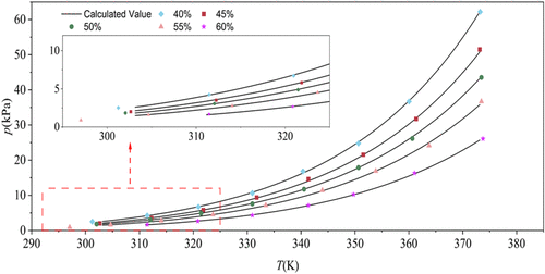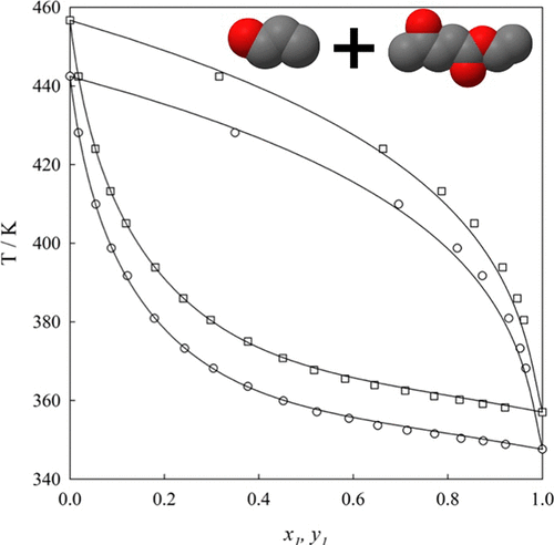 Vapor–liquid equilibria (VLE) of three binary (CO2/dimethyl carbonate, CO2/propylene carbonate, and CO2/acetonitrile) and ternary mixtures (CO2/dimethyl carbonate/propylene carbonate, CO2/dimethyl carbonate/acetonitrile, and CO2/propylene carbonate/acetonitrile) were measured at 313, 333, and 353 K and at pressures up to approximately 200 bar using a variable-volume view cell coupled with gas chromatography (GC) analysis. These measurement results and data collected from earlier works were used to model the phase behavior of these mixtures. Two thermodynamic models were applied to represent the bubble-pressure (pbubl) and vapor-phase composition data (yi): a cubic equation-of-state/excess Gibbs free energy (CEoS/GE) model and the statistical associating fluid theory-γ Mie group-contribution (SAFT-γ Mie) equation of state. For the yi data, the Chrastil correlation was also adopted to test the performance of thermodynamic EoSs. The CEoS/GE model provided a satisfactory correlation of the pressure–composition data, while the SAFT-γ Mie model exhibited good performance in representing ternary data when unlike-interaction parameters were properly adjusted based on binary VLE data.