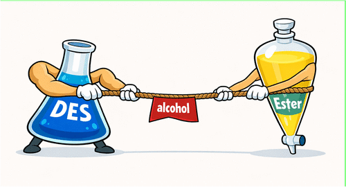 This study investigated the use of a deep eutectic solvent (DES) for separating azeotropic mixtures of alcohol–ester systems. The DES was composed of choline chloride and glycerol. Experimental liquid–liquid equilibrium (LLE) data were acquired for several pseudoternary systems. The studied systems consisted of an alcohol (ethanol, n-propanol, or n-butanol), an ester (n-propyl acetate, n-butyl acetate, ethyl propionate, n-propyl propionate, ethyl acetate, or n-butyl propionate), and the DES as the solvent. The experimental measurements were conducted at 293.15 and 313.15 K and 101.3 kPa. A comparative analysis revealed structure–property relationships, demonstrating how separation performance is affected by the alkyl chain length of both the alcohol and the ester. The efficiency of the separation was evaluated by calculating selectivity and distribution coefficients from the determined tie-line data. This work offers important findings on the viability of using a choline chloride-based DES as an effective agent for breaking azeotropes in alcohol–ester mixtures.