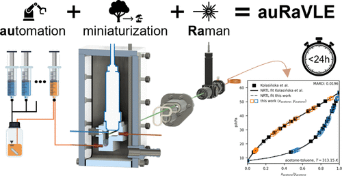 Vapor–liquid equilibrium (VLE) data are limited due to the resource-intensive nature of conventional measurements. Overcoming this limitation calls for compact VLE measurement setups that allow for rapid data generation. In this paper, we present the automated Raman VLE setup (auRaVLE), an automated milliliter-scale VLE setup, using Raman spectroscopy. Miniaturization accelerates equilibration through improved heat and mass transfer, while reducing sample consumption. Raman spectroscopy enables fast, sampling-free in-situ composition analysis in both phases. Automated sample preparation and experiments mitigate common sources of error and allow 24/7 data generation. We validate our setup with vapor pressure measurements of acetone, ethanol, heptane, and toluene over a range of 278.2–343.1 K and 2.2–97.5 kPa. Furthermore, we measure binary VLE (pTxy) for acetone-heptane (313.15 K), acetone-toluene (313.15 K), and acetone-ethanol (328.15 K), which we validate with literature data and consistency tests. With the auRaVLE setup, we can automatically measure binary VLE in under 24 h, thereby significantly accelerating data output to support rapid process design while minimizing sample consumption.