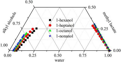 Liquid–Liquid Equilibrium Behavior and Intermolecular Interactions of Water, Methyl Lactate, and Alkyl Alcohols (C6∼C9)