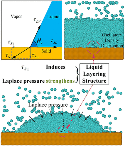 The volume dependence of the contact angle (VDCA) of a droplet at the nanoscale is primarily ascribed to the standard line tension. Researchers have identified additional volume-dependent sources that arise from the liquid layering structure within the three-phase contact zone (TPZ). These sources introduce systematic errors in the analysis of wettability and the measurement of standard line tension in nanodroplets. Therefore, this study examines the effect of the liquid layering structure on the VDCA and contrasts it with the standard line tension. The mechanism is elucidated through a thermodynamic theoretical analysis of the liquid at the adsorbed layer in cylindrical droplets: the liquid layering structure influences the contact angle by altering the liquid density distribution and the corresponding Gibbs adsorption. The validity of the theoretical analysis is confirmed through molecular dynamics simulations of parallel liquid films and cylindrical droplets. This study analyzes the effects of sources associated with liquid layering, including normal solid capillary force and Laplace pressure. The findings demonstrate that the influence of the liquid layering structure on the VDCA is first order in relation to the contact curvature, comparable to the contribution from the standard line. Furthermore, this study examines how the layering liquid structure influences the wettability of nanodroplets, offering a new thermodynamic perspective for understanding the origins of line tension in experimental contexts.
